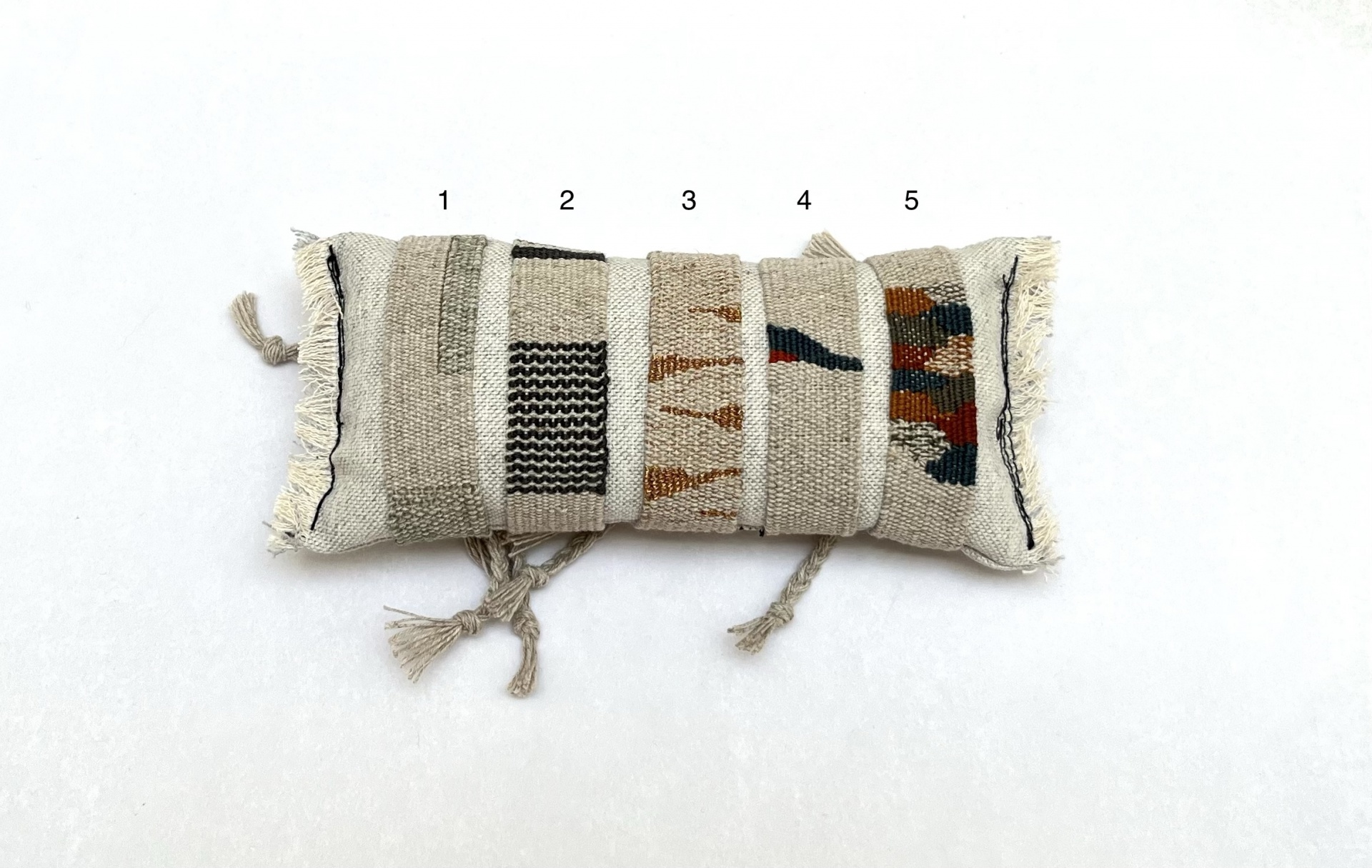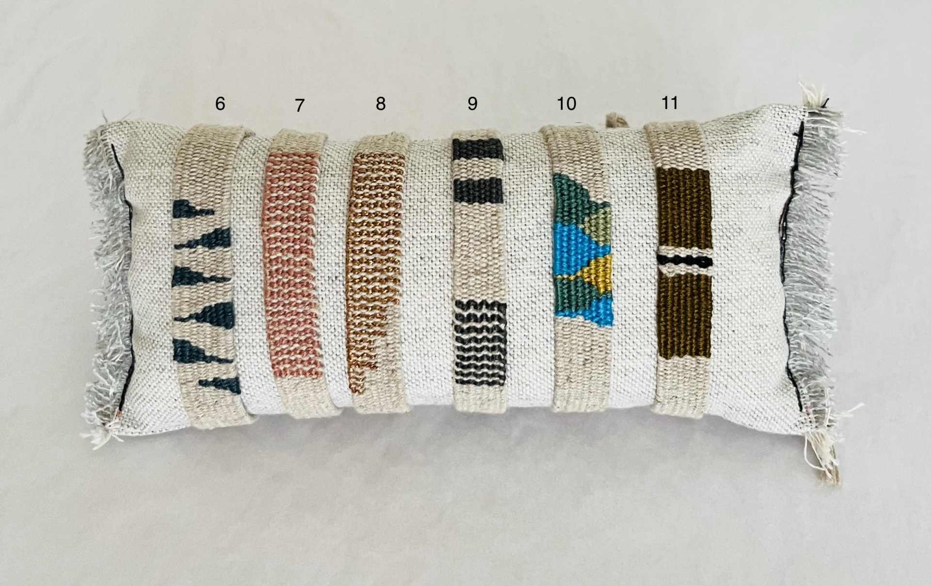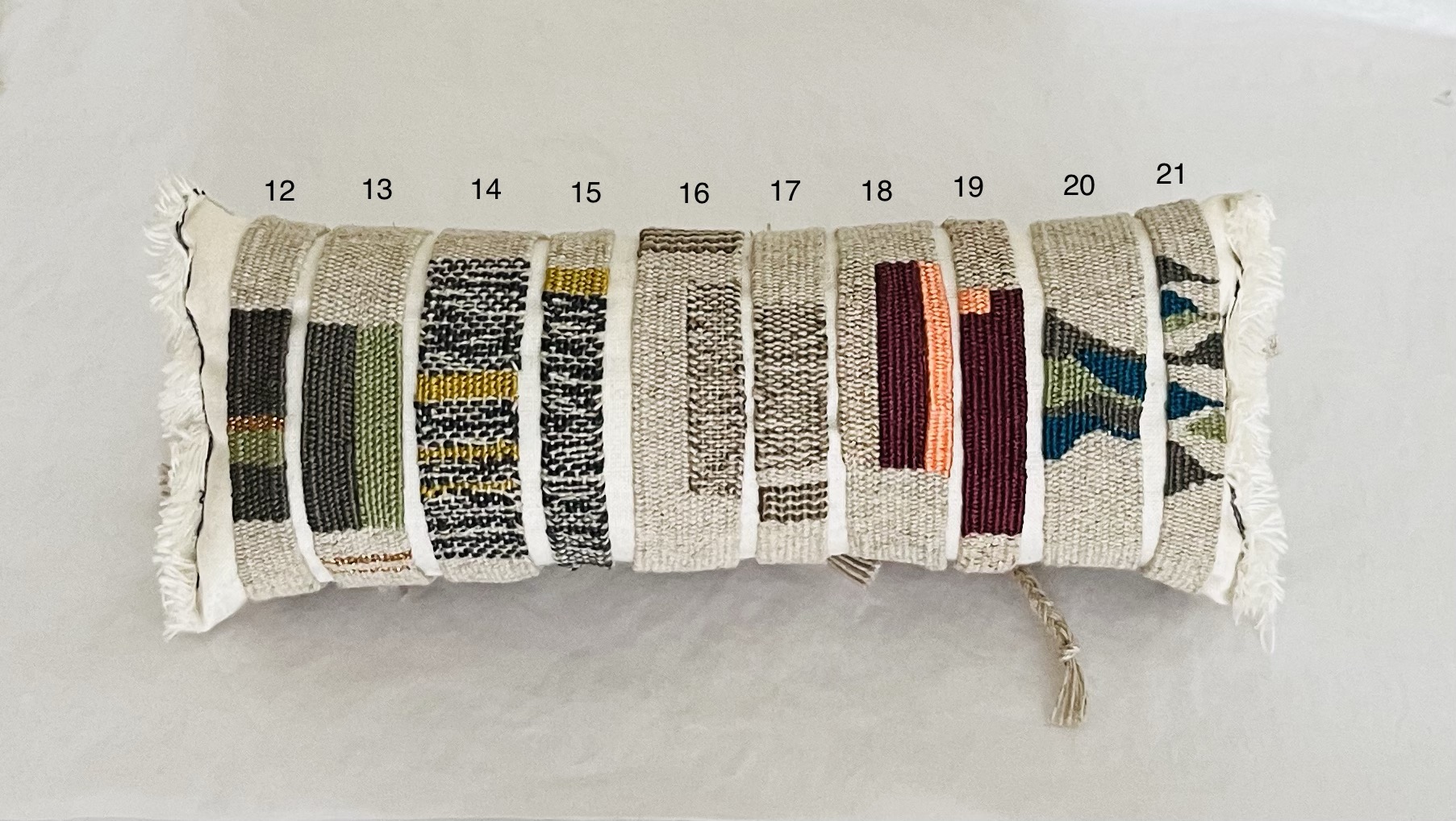 • Almofada retangular com vários padrões tecidos coloridos numerados de 12 a 21