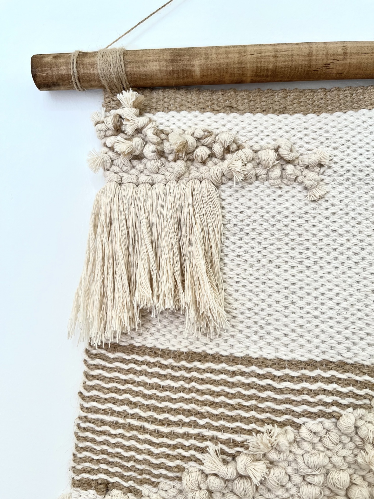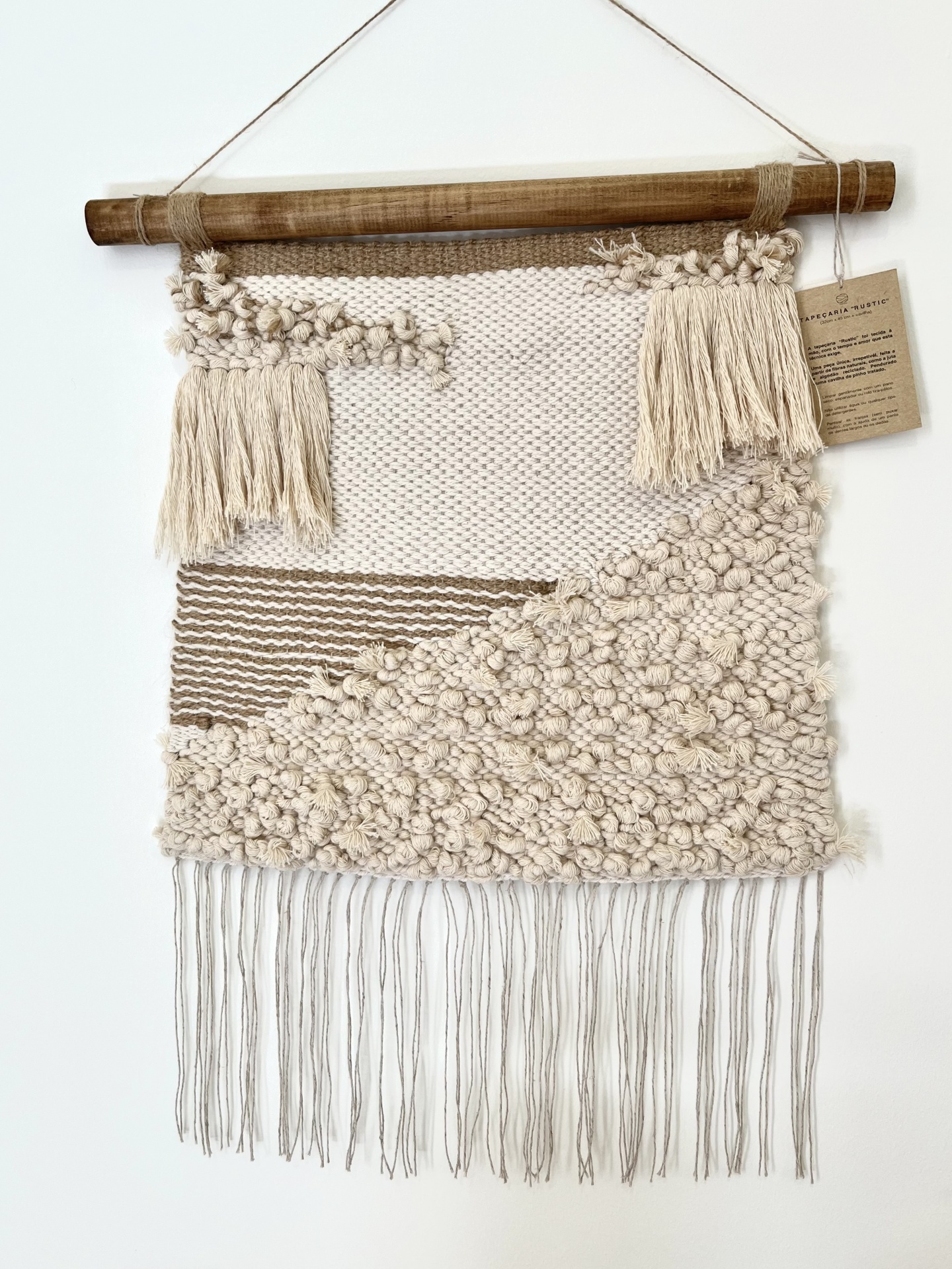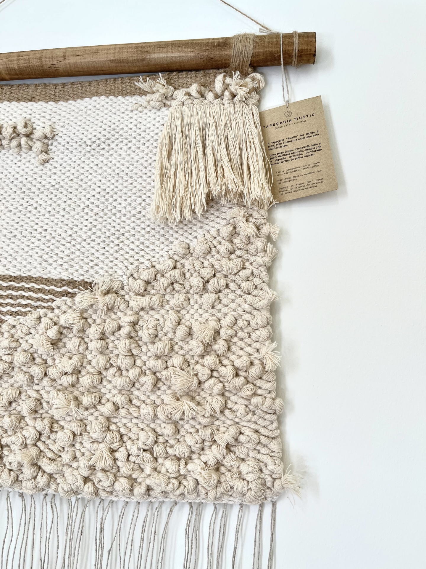 Tapeçaria “Rustic” 95,00 € Desconto de %. IVA incluído. Partilhar Comprar Contactar A tapeçaria "Rustic" foi tecida à mão, com o tempo e amor que esta técnica exige. Uma peça única, irrepetível, feita a partir de fibras naturais, como a juta e algodão reciclado. Pendurada numa cavilha de pinho tratado. *** "Rustic" tapestry was woven by hand, with the time and love that this technique requires. A unique, unrepeatable piece made from natural fibers such as jute and recycled cotton. Hanging in a treated pine dowel. Tamanho/Size 32 cm x 45 cm Designer Catarina Teixeira - Catz the maker Características
